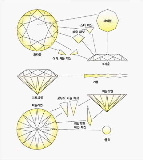 ºê¸±¸®¾ðÆ® ÄÆ (brilliant cut)´ÙÀ̾ƸóµåÀÇ ¿¬¸¶ ¹æ½Ä Áß ÇϳªÀÌ¸ç º¸¼®ÀÇ ¹Ý¦°Å¸²À» ÃÖ´ëÇÑ ²ø¾î³»±â À§ÇÏ¿© 58¸éüÀÇ ´Ù°¢À¸·Î ¿Ï¼ºÇÏ´Â ¹æ¹ýÀÔ´Ï´Ù. »ï°¢Çü ¶Ç´Â ¼¾ç¿¬ ¸ð¾çÀÇ ¸éÀÌ Áß½ÉÁ¡¿¡¼ ¹æ»ç»óÀ¸·Î ´Ã¾î¼ ÀÖ´Â °ÍÀ¸·Î ¶ó¿îµå ºê¸±¸®¾ðÆ® ÄÆ(Round ideal Brilliant cut)°ú ¿À¹ú ÄÆ(ober cut)ÀÌ ±âº»ÀÌ µÇ¸ç ¿¡¸Þ¶öµå ÄÆ(Emerald cut), ¸¶¸£ÄûÁî ÄÆ(Marquis cut), ÀÏ¸í ¹°¹æ¿ï ´ÙÀ̾Ƹóµå·Î ºÒ¸®´Â Æä¾î ÄÆ(Pear cut) µî ´Ù¾çÇÑ ¹æ¹ýÀÌ ÀÖ½À´Ï´Ù. ÆÒ½Ã ÄÆ (fancy cut)ÀϹÝÀûÀÎ ¶ó¿îµåÇüó·³ ´ëºÎºÐ ÁÖº¯¿¡¼ ½±°Ô º¼ ¼ö ÀÖ´Â µÕ±Ù ¸ð¾çÀÇ ´ÙÀ̾Ƹóµå°¡ ¾Æ´Ñ ´Ù¸¥ ¸ðµç ÇüÅÂÀÇ ´ÙÀ̾Ƹóµå¸¦ °¡¸®ÄÑ ÆÒ½Ã ÄÆ(fancy cut)À̶ó°í ºÎ¸¨´Ï´Ù. ÆÒ½Ã ÄÆ¿¡ °üÇÑ µî±ÞÀº ºÎºÐÀûÀÎ ¿ä¼ÒÀÇ °áÇÕº¸´Ù ÀüüÀûÀÎ ÇüŰ¡ ´õ Áß¿äÇÏ´Ù°í º¼ ¼ö ÀÖÀ¸¸ç ¶ó¿îµå ºê¸±¸®¾ðÆ® ´ÙÀ̾Ƹóµå¿¡¼ Áß¿ä½Ã µÇ´Â ¼¼ºÎÀûÀÎ ¿ä¼Òº¸´Ù ÆÒ½Ã ÄÆ¿¡¼´Â ÀüüÀûÀÎ ¿Ü°üÀÌ ´õ Áß¿äÇÏ°Ô ¿©°ÜÁý´Ï´Ù. |