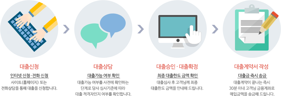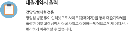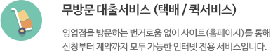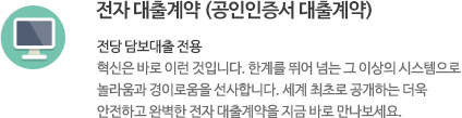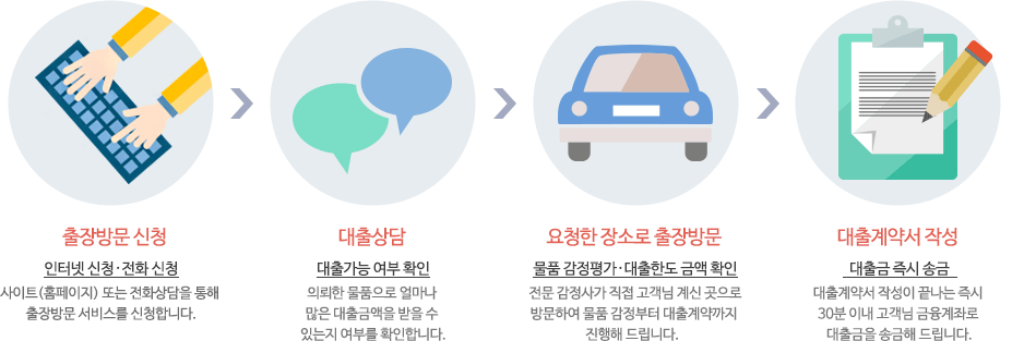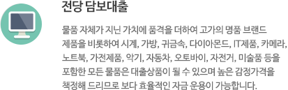 1. ±ÝÀ¶ ºÐ¾ßº°·Î ³ôÀº ¼öÁØÀÇ ½Å·Ú¼º°ú ¶Ù¾î³ È¿À²¼ºÀ» ÀÚ¶ûÇÏ´Â ÃÖÀûÈ ½Ã½ºÅÛ(people, process, product)À» ±â¹ÝÀ¸·Î ÇÑ ÃÖ»óÀÇ ±ÝÀ¶¿ì´ë ¼ºñ½º¸¦ Á¦°øÇØ µå¸³´Ï´Ù. 2. ¼ö½Ã·Î ±Þº¯ÇÏ´Â ±ÝÀ¶½ÃÀåÀÇ ¼ö¿ä¿Í ¿ä±¸¸¦ Áï°¢ ¹Ý¿µÇÑ °¢Á¾ ´ëÃâ»óǰ°ú ´Ù¾çÇÑ »óȯ¹æ½ÄÀ» °í°´´ÔÀÇ »óȲ°ú ¿©°Ç¿¡ µû¶ó ¼±ÅÃÇÏ½Ç ¼ö ÀÖ½À´Ï´Ù. 3. ¿µ¾÷Á¡ ¹æ¹® ¾øÀÌ ÀÎÅͳÝÀ» ÅëÇØ Àü´ç ´ãº¸´ëÃâ °è¾àÀ» ¼öÇàÇÒ ¼ö ÀÖ´Â °¡Àå ¿Ïº®ÇÑ ¿Â¶óÀÎ µ¿»ê´ãº¸´ëÃâ½Ã½ºÅÛ (Online system for movable property mortgage loan)À» Á¦°øÇØ µå¸®¹Ç·Î ½Ã°£°ú Àå¼Ò¿¡ °ü°è¾øÀÌ °£ÆíÇÏ°Ô ÀÌ¿ëÇÏ½Ç ¼ö ÀÖ½À´Ï´Ù. 4. °í°´´Ô²²¼ ¿øÇϽô ½Ã°£°ú Àå¼Ò¿¡ ¸ÂÃç ´ëÃâ´ã´çÀÚ°¡ Á÷Á¢ ¹æ¹®ÇÏ¿© ½ÅûºÎÅÍ °è¾à±îÁö »ó¼¼ÇÑ »ó´ã°ú ÁøÇàÀ» µµ¿Íµå¸®´Â ÃâÀ广¹® ¼ºñ½º¸¦ Áö¿øÇØ µå¸³´Ï´Ù. 5. ´ëÃâ ½ÅûºÎÅÍ ´ëÃâ±Ý Áö±Þ±îÁö(One Stop Service) ÀÌ ¸ðµç °úÁ¤ÀÌ ºÒ°ú 24½Ã°£ À̳» ÀÌ·ïÁý´Ï´Ù. 6.°í°´´ÔÀÇ ¸¸Á·À» ÃÖ¿ì¼±À¸·Î »ý°¢ÇÏ¸ç º¸´Ù ³ªÀº ¼ºñ½º Á¦°øÀ» À§ÇØ ¼ÒÁßÇÑ ÀÇ°ß ÇϳªÇϳª¸¦ ¼¼½ÉÇÏ°Ô °æÃ»ÇÏ¿© ´õ¿í °íǰÁúÀÇ ±ÝÀ¶¼ºñ½º¸¦ Á¦°øÇϰíÀÚ ÃÖ¼±ÀÇ ³ë·ÂÀ» ´ÙÇϰí ÀÖ½À´Ï´Ù.
